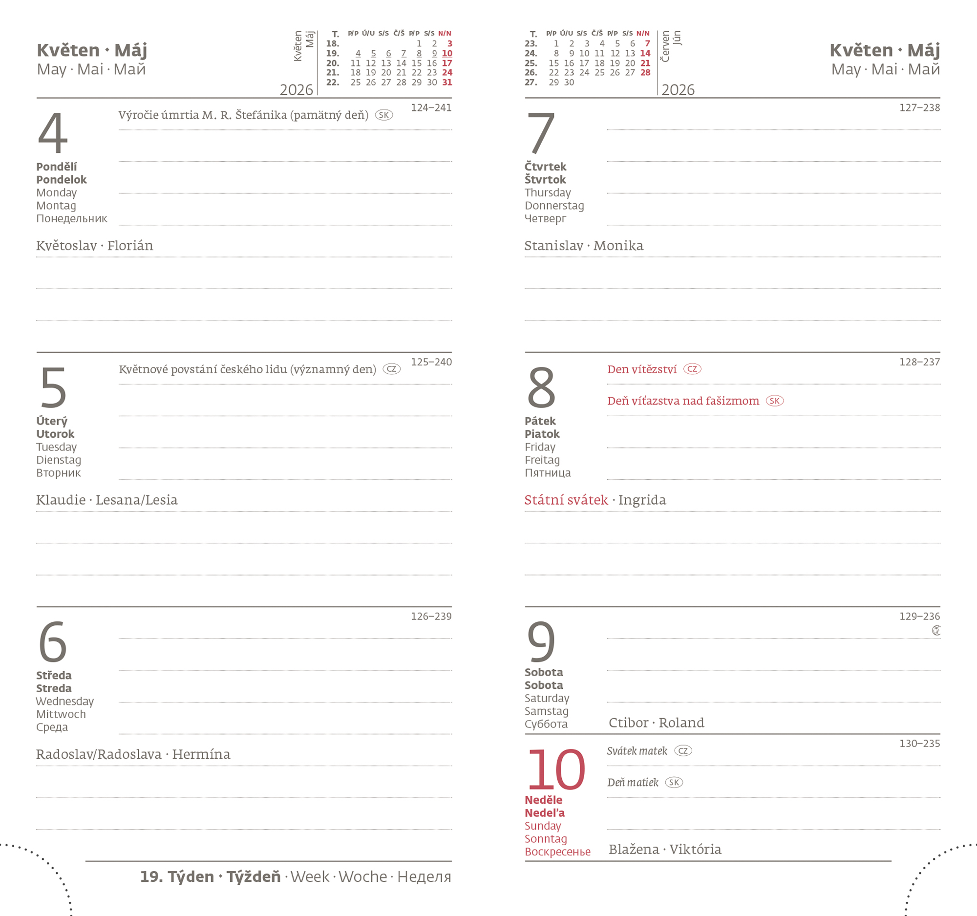 Diář obsahuje: osobní údaje, plánovač dovolené (měsíční přehled), plánovací kalendář, mezinárodní svátky, roční výhled, týdenní layout, adresář