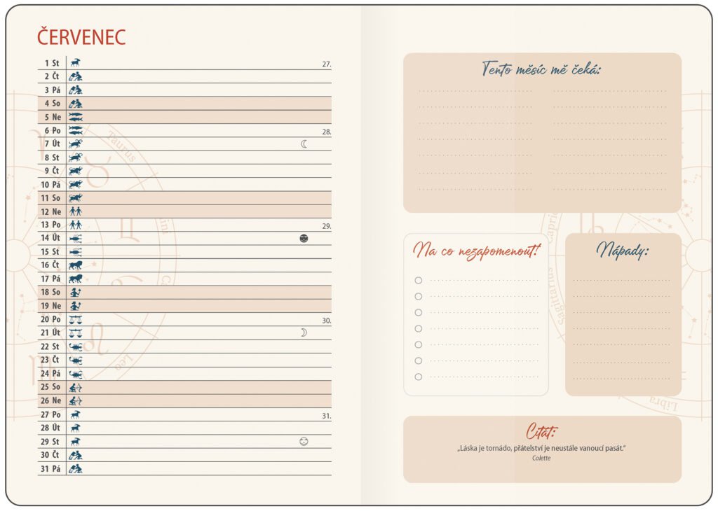 Lunární diář Diář orientovaný na praktické rady, podle kterých se můžete řídit během lunárního cyklu a s informacemi týkajícími se péče o tělo, domácnost, kutilství a zahradu. Desky jsou vyrobeny z matného lamina s oblíbeným hedvábným povrchem soft touch. Diáře jsou doplněny gumičkou přes hřbet, záložkou a třemi aršíky kreativních samolepek.