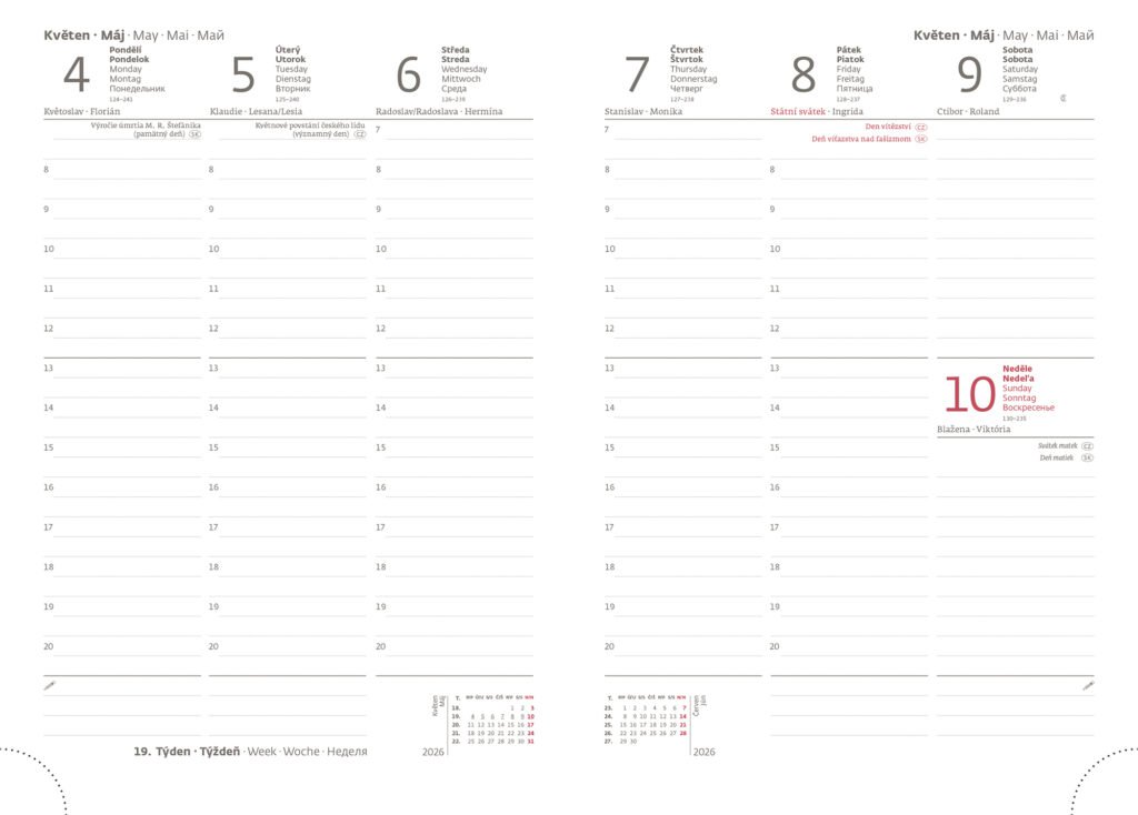 Formát diára: 145 x 205 mm Rozsah diára: 128 strán Kalendárium: týždenné