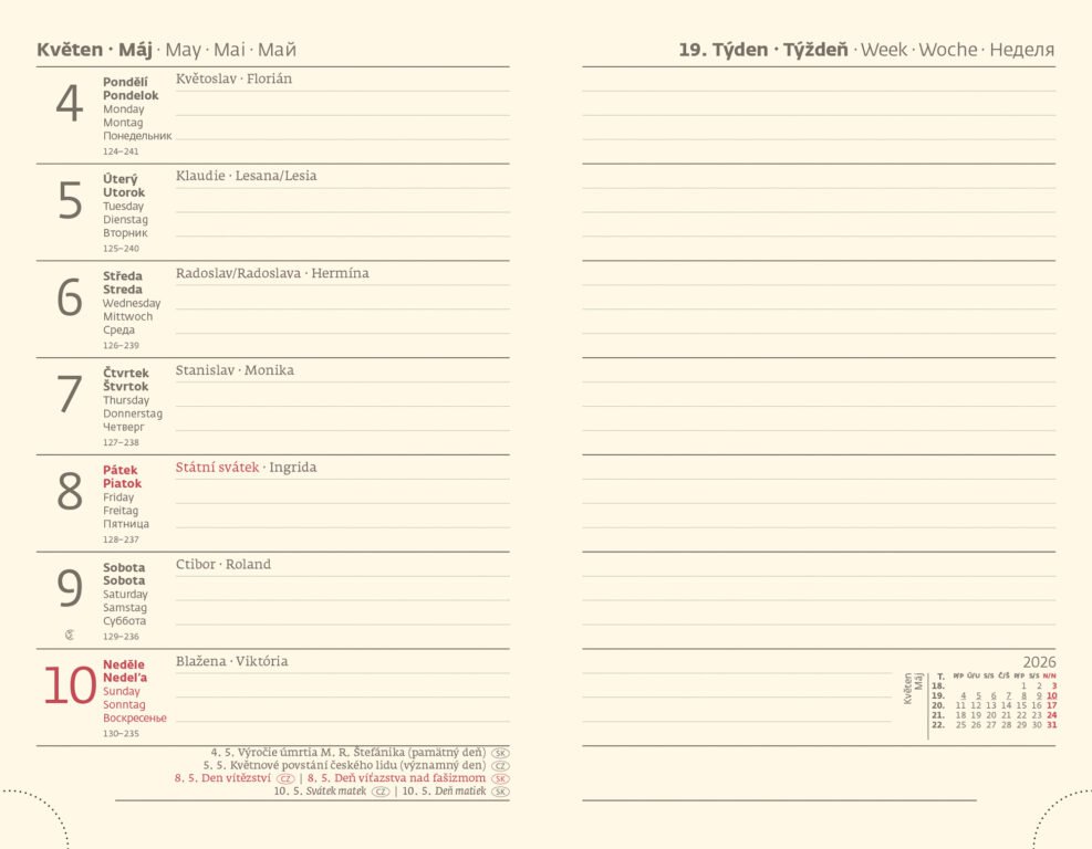 Formát diára: 90 x 140 mm Rozsah diára: 128 strán Kalendárium: týždenné vreckové + pútko na pero + papier bloku chamois